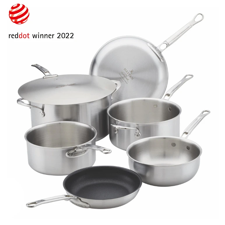 The triple-bonded 18/10 stainless-steel construction featuring Hestan’s exclusive ProCoreâ„¢ aluminum delivers 35% greater heat conductivity. That means faster, more consistent heating, plus faster recovery time to stay in control of temperature and timing. In addition, you’ll find that the sauté pans, sauce pots, rondeau, saucier, and stock pot are wider, not taller, to increase cooking surface for better heating, browning, and enhanced flavor. The set also contains an 8.5-inch sauté pan that is finished with TITUMâ„¢ nonstick, multi-layer system – the world’s most durable nonstick. Completing this assortment of pots and pans, is the 12.5″ universal lid with Hestan steam vents to reduce boil overs, pressure, and eliminate rattling. Durable, innovative sealed rims make this thoughtfully crafted cookware set 100% dishwasher safe, while purposeful engineering accommodates a wide range of culinary needs including oven and broil safe to 600°F*.