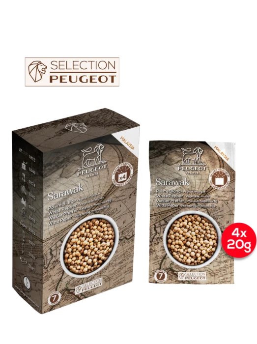 Sarawak white pepper is grown in the northern state of Sarawak on the island of Borneo, which is extensively covered by an equatorial forest. Once harvested, the peppercorns are soaked in water for a few hours to remove the pulp and leave only the beige-coloured seed, which is then dried. This pepper has a bold flavour that blossoms into mingling notes of fruit, cocoa and woody spice. It is the perfect accompaniment for white meat, white fish and vegetables but isalso simply amazing with an orange or pear-based dessert.