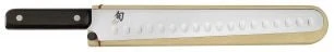 The Shun Classic Brisket Knife is the perfect tool for a barbeque or family feast. It’s ideal for trimming and slicing larger cuts of meat, including brisket, ham, turkey, and roasts. The high-performance Japanese AUS10A blade is highly refined, high-carbon, vanadium stainless steel, enabling it to take and hold its Shun-sharp edge longer. The Shun Classic Brisket Knife’s long, narrow blade makes it easy to cut slices in a single pass to ensure more of the juices—and flavor—stay inside the meat. The long, razor-sharp blade means slices will look perfect since there’s no need to saw back and forth. Hollow-ground indentations on the blade help food release more easily and the rounded tip makes the knife safer and easier to use. Full-tang construction ensures the Classic Brisket Knife is strong and well balanced. PakkaWood handles with an ebony finish complete the brisket knife’s handsome look. The included wooden saya, or sheath, protects the blade and makes it simple to transport to a barbeque or celebration taking place away from home.