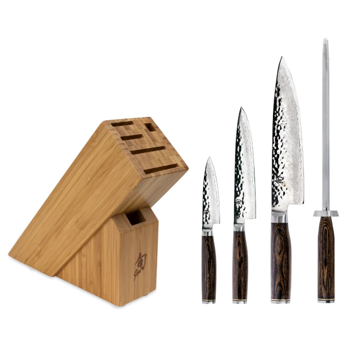 The Shun Premier 5-piece Starter Set gets your Premier collection started beautifully. You get the three most-needed kitchen knives—the Shun Premier 8-inch Chef’s Knife, the 4-inch Paring Knife, and the 6.5-inch Utility Knife. There’s also a Premier Combination Honing Steel to help you maintain your edge. Everything fits in our Slimline Bamboo Block—with room to expand. There is one additional knife slot, plus one to accommodate a handy pair of kitchen shears.