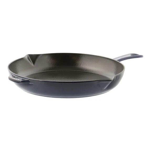 The Staub fry pan browns foods beautifully, be it chicken breasts, potatoes, or bacon. The enameled black matte interior imparts texture, promoting exceptional browning. Cast iron offers steady, even heat distribution, so the temperature of the pan won’t drop as you cook. Low, curved sides make it easy to flip the food, which releases easily.Staub enameled cast iron cookware is the choice of the world’s best chefs. With exceptional durability, it is perfect for day-to-day use in both gourmet home kitchens and prestigious restaurants around the world. Each piece transitions beautifully from the kitchen to the table. Built to last a lifetime, these heirloom pieces can be passed from generation to generation.
