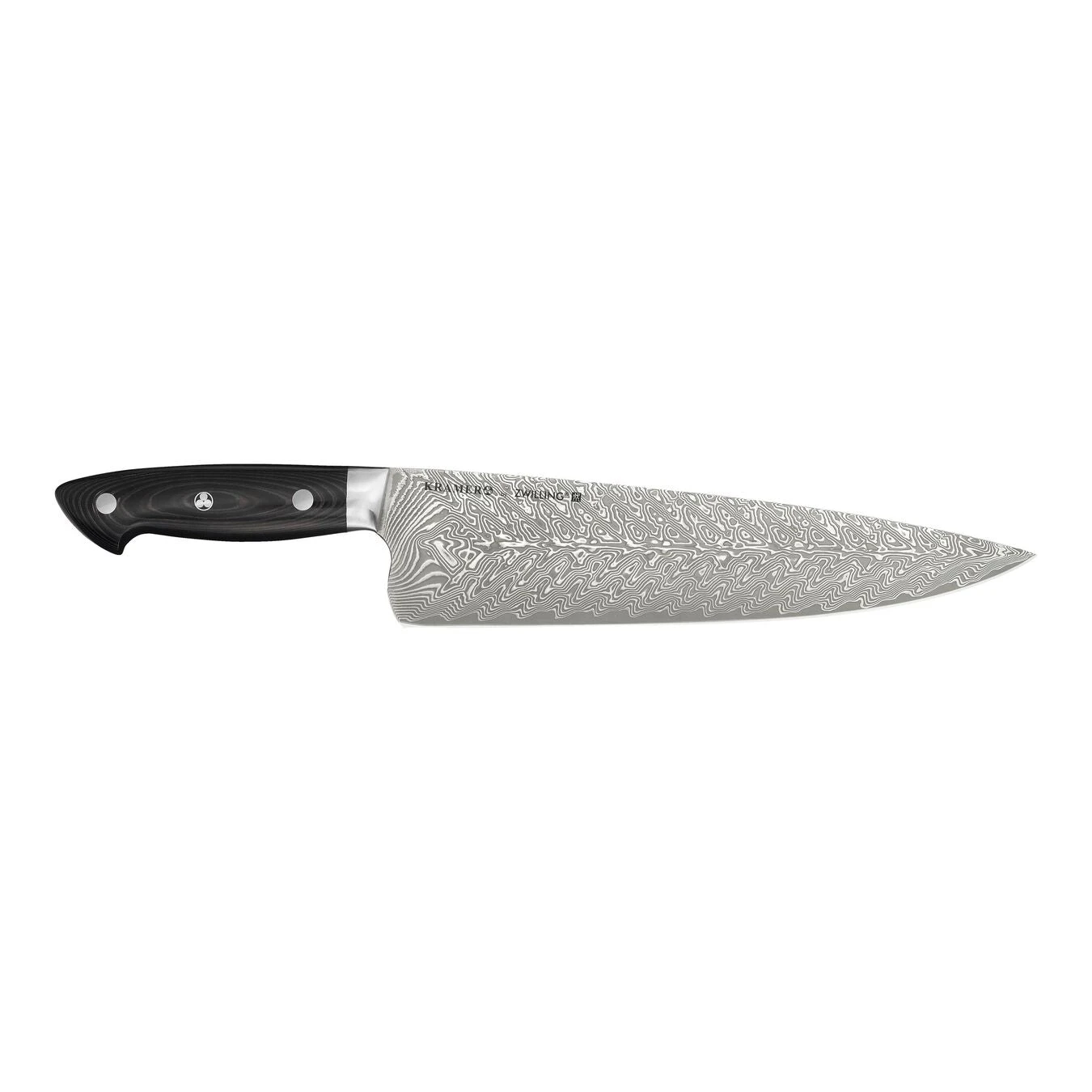 Created with Master Bladesmith Bob Kramer, the KRAMER by ZWILLING EUROLINE Stainless Steel Damascus Collection features stainless steel blades made to his exacting standards, maximizing curves, balance and utility.Bob’s design has an extremely wide blade to maximize knuckle clearance for larger hands and for cutting through large produce and piles of food. Chopped food can easily be transported with this impressive, broad blade.The knives are hand-finished with a traditional 3-step process by skilled Japanese artisans. Combined with the SG2 micro-carbide powder steel, the ice-hardened CRYODUR blades deliver scalpel-like sharpness, stay sharper longer and can withstand more sharpening over their lifespan. The SG2 super steel core is protected by an exceptionally beautiful 100-layer Chevron Damascus pattern, which is complimented by a stunning black linen Micarta handle and signature Bob Kramer mosaic pin.