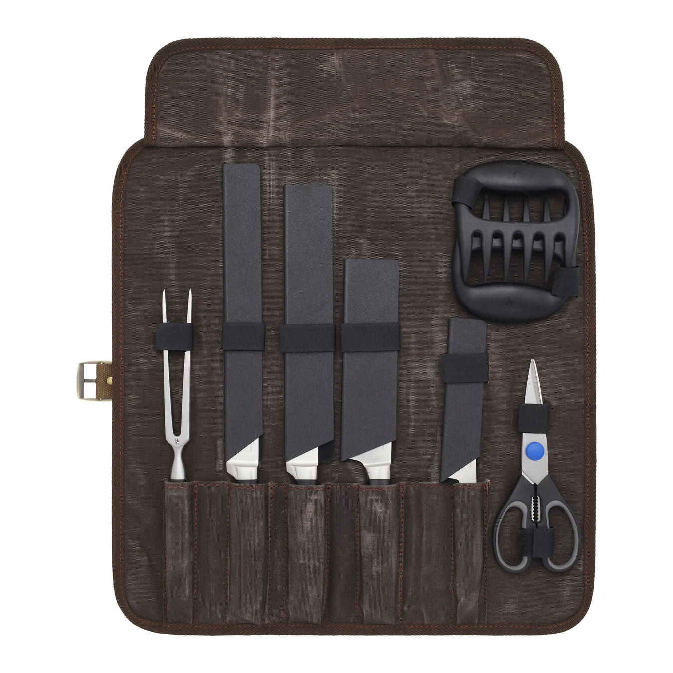 - 9-piece set includes 11-inch buffet knife, 10-inch rib knife, 7-inch rocking santoku, 5.5-inch prep knife, carving fork, shears, set of 2 bear claws, a sheath for each blade, and canvas roll bag