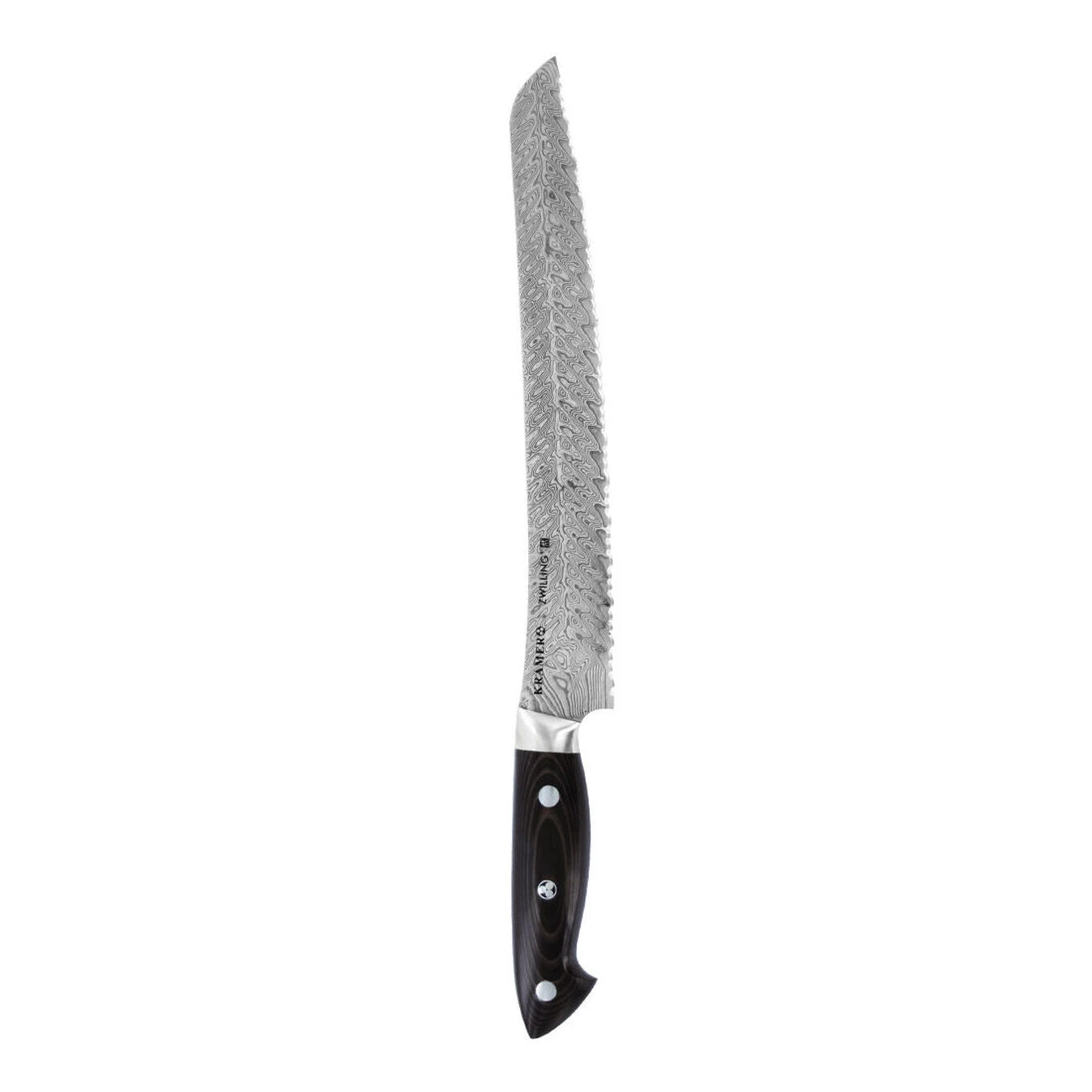 Created with Master Bladesmith Bob Kramer, the KRAMER by ZWILLING EUROLINE Stainless Steel Damascus Collection features stainless steel blades made to his exacting standards, maximizing curves, balance and utility.Bob’s design has an extremely wide blade to maximize knuckle clearance for larger hands and for cutting through large produce and piles of food. Chopped food can easily be transported with this impressive, broad blade.The knives are hand-finished with a traditional 3-step process by skilled Japanese artisans. Combined with the SG2 micro-carbide powder steel, the ice-hardened CRYODUR blades deliver scalpel-like sharpness, stay sharper longer and can withstand more sharpening over their lifespan. The SG2 super steel core is protected by an exceptionally beautiful 100-layer Chevron Damascus pattern, which is complimented by a stunning black linen Micarta handle and signature Bob Kramer mosaic pin.